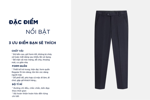 - Màu sắc trẻ trung, thanh lịch, rất dễ phối đồ: Có thể mặc với áo sơ mi, áo polo, áo phông,...Quần âu rất đa năng phù hợp cả khi mặc đi chơi, đi làm, đi gặp khách hàng,...