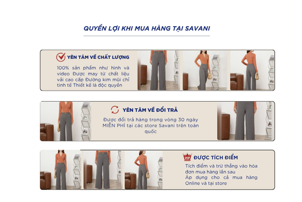 - Hỗ trợ đổi hàng trong vòng 30 ngày và miễn phí tại tất cả chi nhánh thuộc hệ thống thời trang Savani.