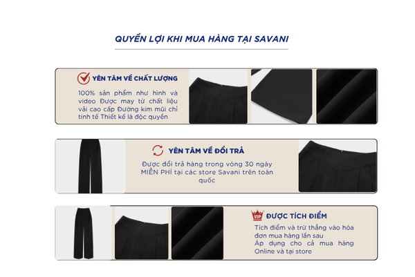 - Hỗ trợ đổi hàng trong vòng 30 ngày và miễn phí tại tất cả chi nhánh thuộc hệ thống thời trang Savani.