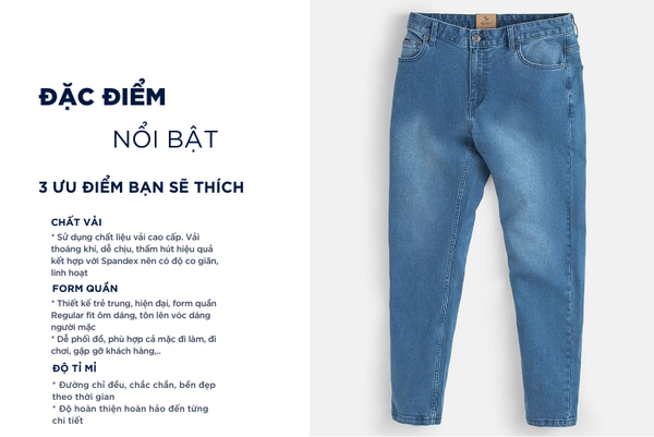 - Màu sắc trẻ trung, thanh lịch, rất dễ phối đồ: Có thể mặc với áo sơ mi, áo polo, áo phông,...Quần jean rất đa năng phù hợp cả khi mặc đi chơi, đi tập thể thao hay cũng có thể mặc ở nhà, đi ngủ