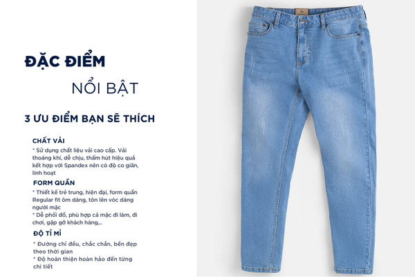 - Màu sắc trẻ trung, thanh lịch, rất dễ phối đồ: Có thể mặc với áo sơ mi, áo polo, áo phông,...Quần jean rất đa năng phù hợp cả khi mặc đi chơi, đi tập thể thao hay cũng có thể mặc ở nhà, đi ngủ