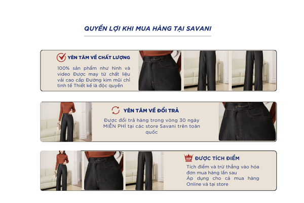 - Hỗ trợ đổi hàng trong vòng 30 ngày và miễn phí tại tất cả chi nhánh thuộc hệ thống thời trang Savani.