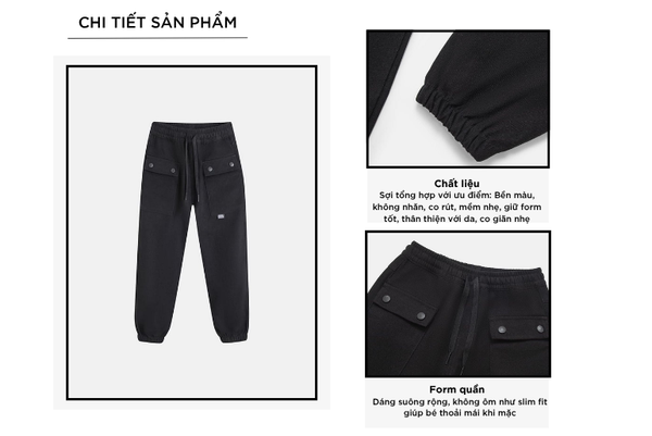 - Quần jogger trẻ em với thiết kế đơn giản, đa năng, dễ mặc phom dáng vừa vặn phù hợp nhiều dáng người.