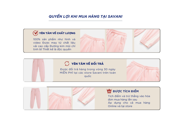 - Hỗ trợ đổi hàng trong vòng 30 ngày và miễn phí tại tất cả chi nhánh thuộc hệ thống thời trang Savani.