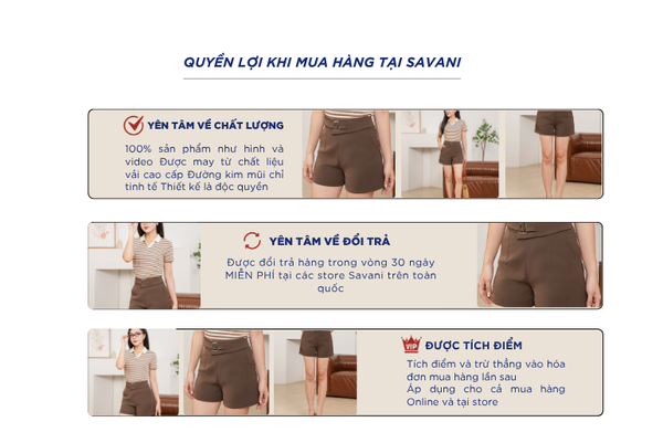 - Hỗ trợ đổi hàng trong vòng 30 ngày và miễn phí tại tất cả chi nhánh thuộc hệ thống thời trang Savani.