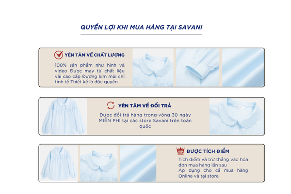 - Hỗ trợ đổi hàng trong vòng 30 ngày và miễn phí tại tất cả chi nhánh thuộc hệ thống thời trang Savani.