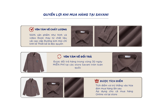 - Hỗ trợ đổi hàng trong vòng 30 ngày và miễn phí tại tất cả chi nhánh thuộc hệ thống thời trang Savani.