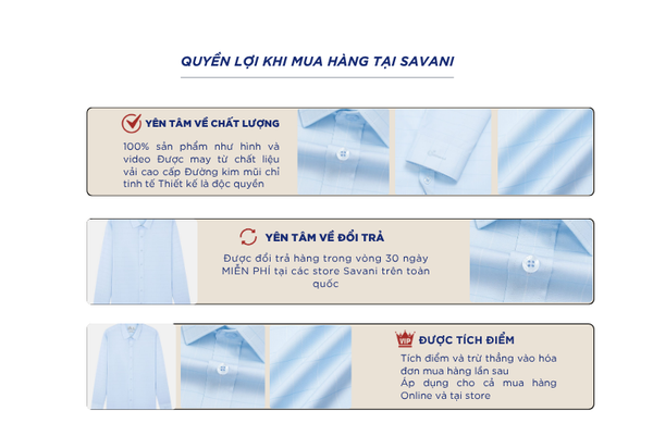 - Hỗ trợ đổi hàng trong vòng 30 ngày và miễn phí tại tất cả chi nhánh thuộc hệ thống thời trang Savani.