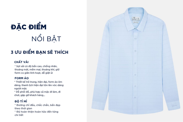 - Áo sơ mi dài tay nam được thiết kế theo phong cách hiện đại, tinh tế, sang trọng lịch lãm dành riêng cho nam giới yêu thích sự chỉn chu nhưng vẫn thoải mái trong mọi hoạt động. Tay áo có thể xắn lên để tạo sự năng động, trẻ trung
