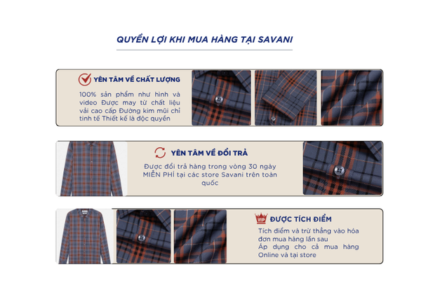 - Hỗ trợ đổi hàng trong vòng 30 ngày và miễn phí tại tất cả chi nhánh thuộc hệ thống thời trang Savani.