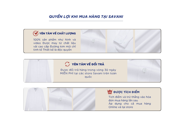 - Hỗ trợ đổi hàng trong vòng 30 ngày và miễn phí tại tất cả chi nhánh thuộc hệ thống thời trang Savani.
