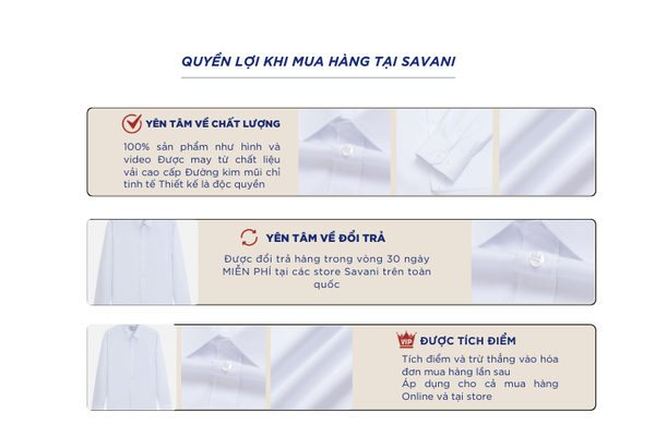 - Hỗ trợ đổi hàng trong vòng 30 ngày và miễn phí tại tất cả chi nhánh thuộc hệ thống thời trang Savani.