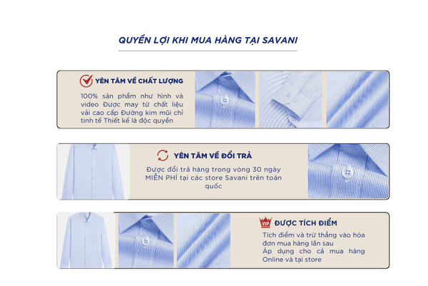 - Hỗ trợ đổi hàng trong vòng 30 ngày và miễn phí tại tất cả chi nhánh thuộc hệ thống thời trang Savani.