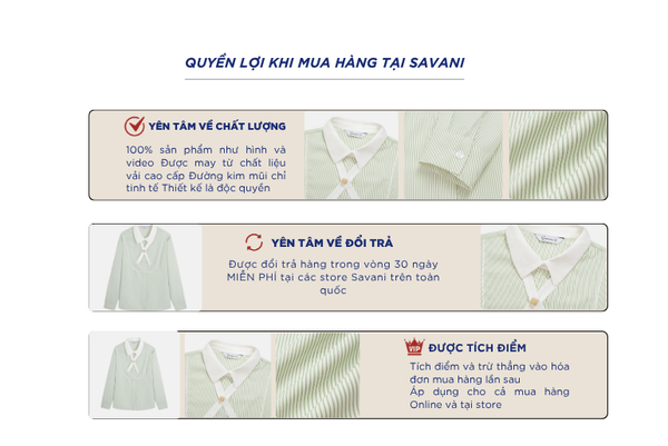 - Hỗ trợ đổi hàng trong vòng 30 ngày và miễn phí tại tất cả chi nhánh thuộc hệ thống thời trang Savani.