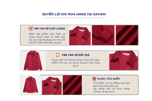 - Hỗ trợ đổi hàng trong vòng 30 ngày và miễn phí tại tất cả chi nhánh thuộc hệ thống thời trang Savani.