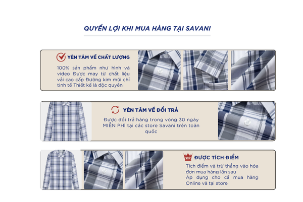 - Hỗ trợ đổi hàng trong vòng 30 ngày và miễn phí tại tất cả chi nhánh thuộc hệ thống thời trang Savani.