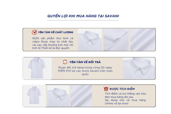 - Hỗ trợ đổi hàng trong vòng 30 ngày và miễn phí tại tất cả chi nhánh thuộc hệ thống thời trang Savani.