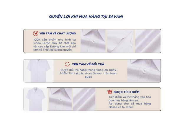 - Hỗ trợ đổi hàng trong vòng 30 ngày và miễn phí tại tất cả chi nhánh thuộc hệ thống thời trang Savani.