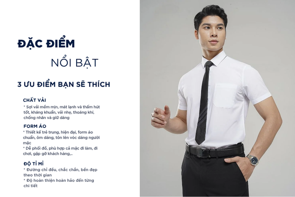 - Áo sơ mi ngắn tay nam được thiết kế theo phong cách hiện đại, tinh tế dành riêng cho nam giới yêu thích sự chỉn chu nhưng vẫn thoải mái trong mọi hoạt động.