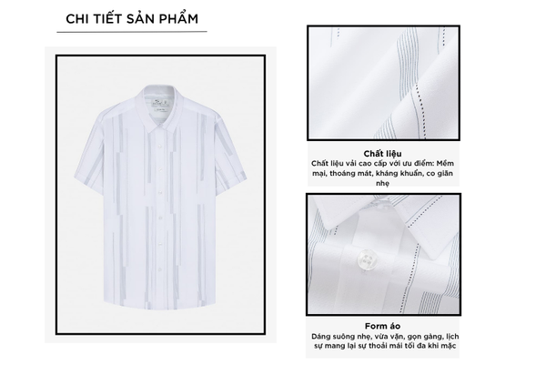 - Áo sơ mi ngắn tay nam được thiết kế theo phong cách hiện đại, tinh tế, sang trọng lịch lãm dành riêng cho nam giới yêu thích sự chỉn chu nhưng vẫn thoải mái trong mọi hoạt động.