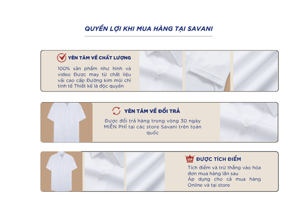 - Hỗ trợ đổi hàng trong vòng 30 ngày và miễn phí tại tất cả chi nhánh thuộc hệ thống thời trang Savani.