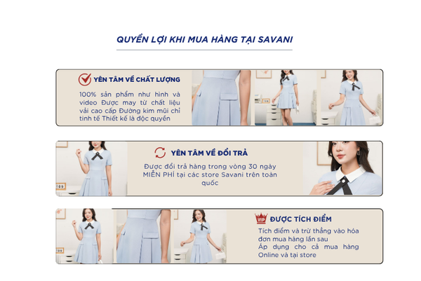 - Hỗ trợ đổi hàng trong vòng 30 ngày và miễn phí tại tất cả chi nhánh thuộc hệ thống thời trang Savani.